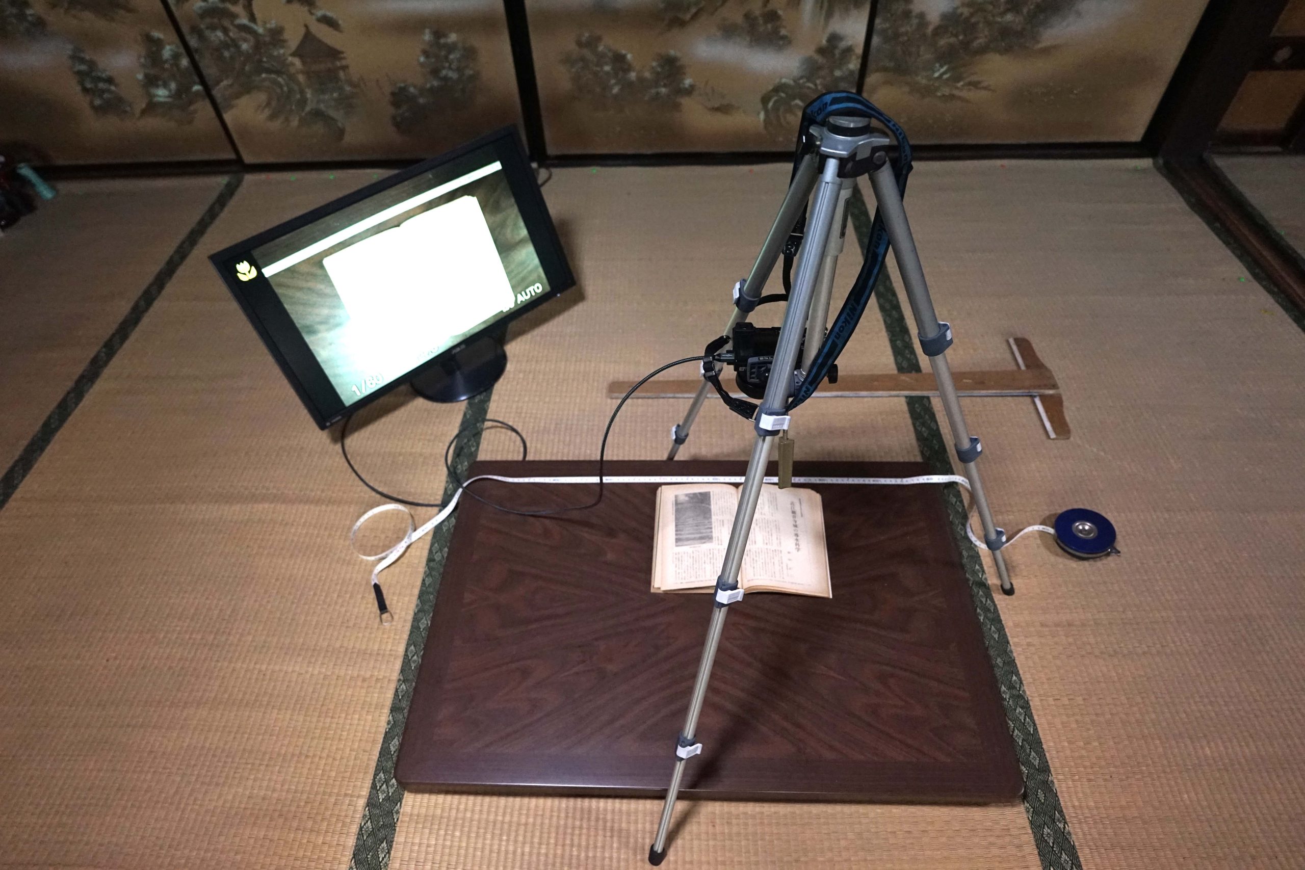 試し撮り。古文書まわりの明るさが均一になるように調整する必要あり。